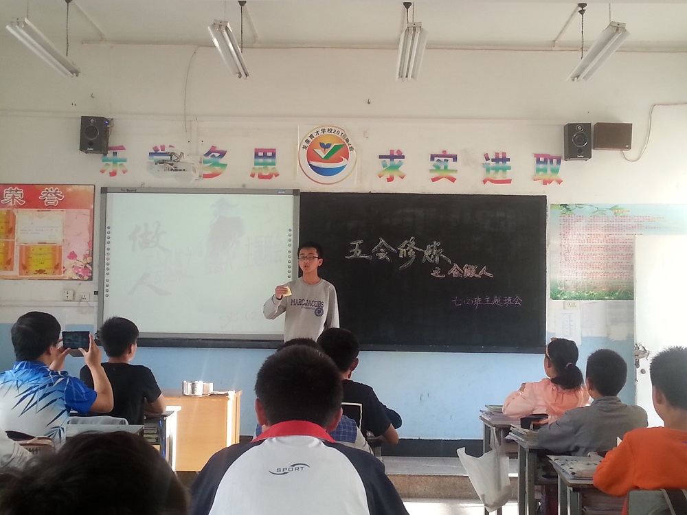 本學期的“五會”主題班會展示課,一至八年級每個班選定的主題各不相同,但都緊緊圍繞“五會1000”分修煉來選定。如七(1 )班是最先展示的班級,選定的主題是“會學習”。此前剛剛結束月考,有的同學因為考不好而垂頭喪氣。為了鼓舞志氣,班主任成兵老師和班委商量,制定了“會學習”這個主題。整個活動由學生主持和開展互動,既有取得優異成績的同學介紹學習方法和成功經驗,又有考得差的或退步的同學進行自我反思。大家在交流中相互鼓勵,并提出了新的奮斗目標,整個活動異常熱烈。七(2)班則針對班上一些不良的行為習慣和生活習慣,以“會做人”為主題進行開展,從個人衛生、儀容儀表、遠離不良嗜好等方面去強調“如何做一名健康、積極向上的陽光少年”,班干部張少康為這個主題制作了形象生動課件,其中收集的素材引人深思。同學們在主持的過程中所表現出來的輕松幽默、條理清晰,獲得了在場老師們和各班班長的一致好評。該班通過幾名同學對良好生活習慣、行為習慣,道德品質等作了介紹與演講,師生互動積極,氣氛活躍,詮釋了良好習慣的魅力和不良習慣的危害,把養成好習慣變成了學生的自我需要。