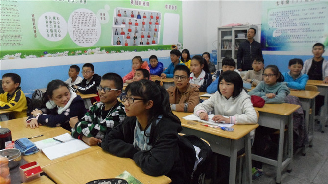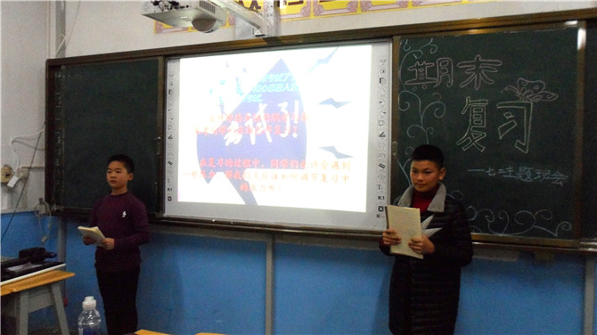 在七(2)班的教室里,每一個學生都安安靜靜地注視著講臺,因班主任馬愛明帶學生去看病了,由兩位男生負責主持本次活動。只見屏幕上展示了“聯考和期末考試即將來到,你是否做好了復習準備?”,“你將如何調節在復習中的壓力?”等問題。臺上的兩位主持人和同學們進行了互動,同學們展開了討論,他們各抒己見,發表了自己的看法,場面異常熱烈。