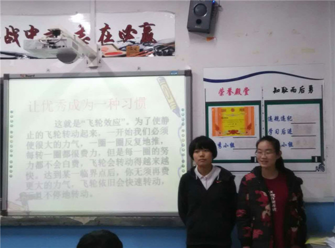 九年級兩個班的班會主題是“讓優秀成為一種習慣”。班主任駱陽和彭娥老師讓學生進行交流發表感言后,告誡學生每一位中學生要有遠大的理想目標追求,有報效國家之心,這是努力學習的動力。為此,兩位班主任引導同學們:一要嚴以律己,克服生活和學習上的惰性;二要學會學習,學會思考,不斷進行自我反省、自我總結;三要樂觀、自強不息、自信、熱愛生活,即使在最失意的時候也不要放棄希望;四要珍惜時間,科學安排時間學習,提高學習效率;五要有吃苦的精神,要學會堅強、百折不撓、愈挫愈勇。最后,同學們還從中明白:原來,優秀也可以成為一種習慣。