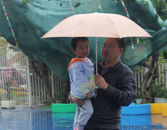 下雨天,王成順師傅到幼兒園門口接孩子們入園
