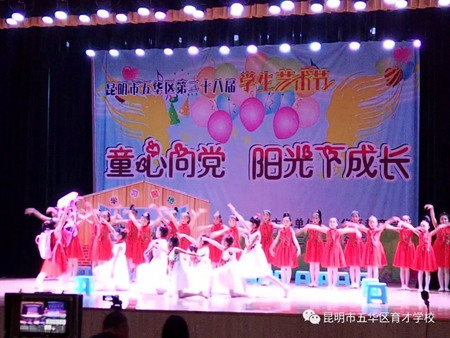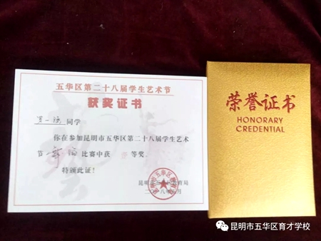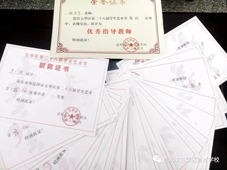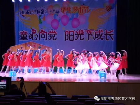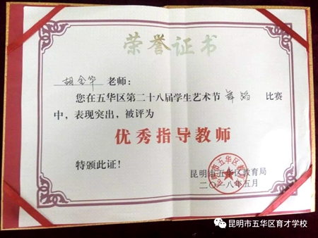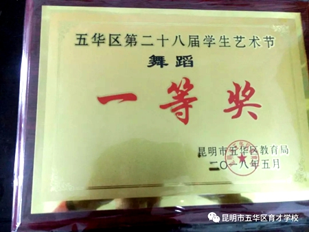 昆明市五華區(qū)育才學(xué)校舞蹈隊(duì)情景舞蹈《明天我要上學(xué)了》參加五華區(qū)第二十八屆中小學(xué)生藝術(shù)節(jié)“童心向黨 陽(yáng)光下成長(zhǎng)”舞蹈比賽活動(dòng)。在昆明市五華區(qū)公民辦小學(xué)28個(gè)參賽隊(duì)中脫穎而出,獲得9.901分的好成績(jī)!喜獲一等獎(jiǎng),創(chuàng)學(xué)校歷史新高!胡金華老師也被評(píng)為優(yōu)秀指導(dǎo)教師!