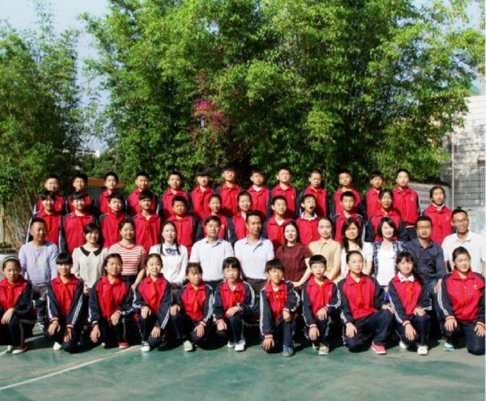 大家一起說“茄子”——六(2)班全體師生與學校領導合影