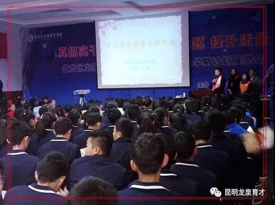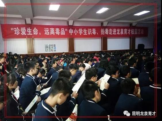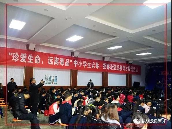由昆明龍泉育才學校和云南陽光公益攜手組織的“珍愛生命、遠離毒品”中小學生識毒、拒毒走進龍泉育才校園活動,活動于2017年12月8日周五下午14:30準時開始,龍泉育才學校部分教師及學生家長有50人,學生360人,陽光公益志愿者9人,昆明教育電視臺2人,共計420余人參加活動。本次活動得到云南省公安廳禁毒局的指導與支持,昆明教育電視臺、龍泉育才學校電視臺全程報道本次活動,陽光公益志愿者李佳主持開場并介紹到場嘉賓。