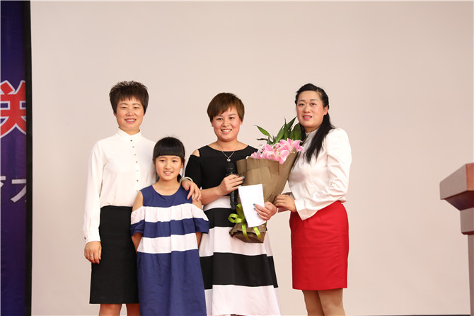 鄒宜欣和媽媽一起上臺發言,表達了對盧艷校長(左一)和班主任王熙鳳老師(右一)的感激之情