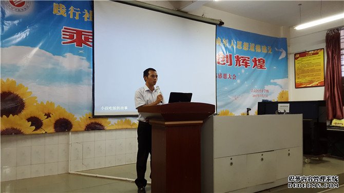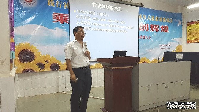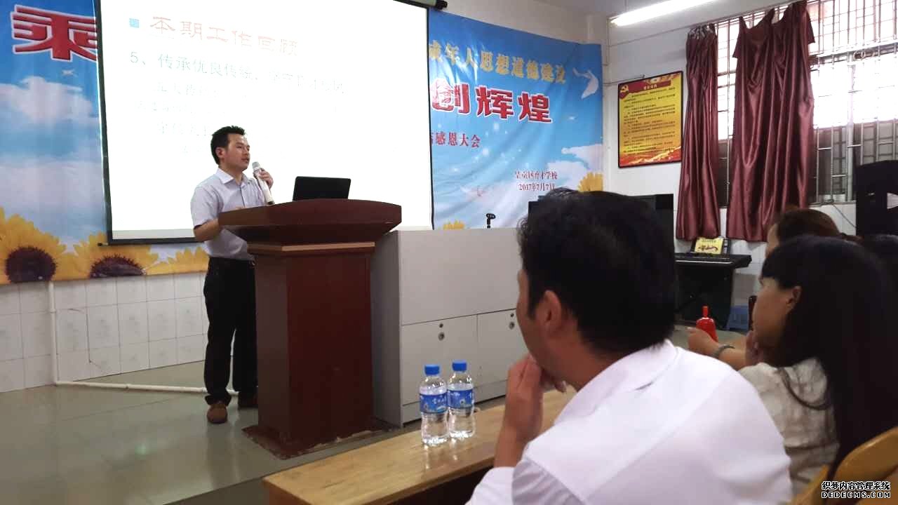 在會歌和校歌嘹亮的歌聲中,學校行政領導進行期末總結感恩交流。開場的是德育處的劉紅波老師,他圍繞《注重細節,抓實德育——共同提升育才品牌競爭力》,主要從師德師風建設、五會修煉的深化等方面進行感恩總結。總結包括黨員同志的先鋒示范作用、骨干教師的引領作用、青年班主任的成長以及調試五會班級管理綜合評價方案、學生幫扶、五會延伸、以活動促修煉,乘“創城創文”東風推進五會修煉。